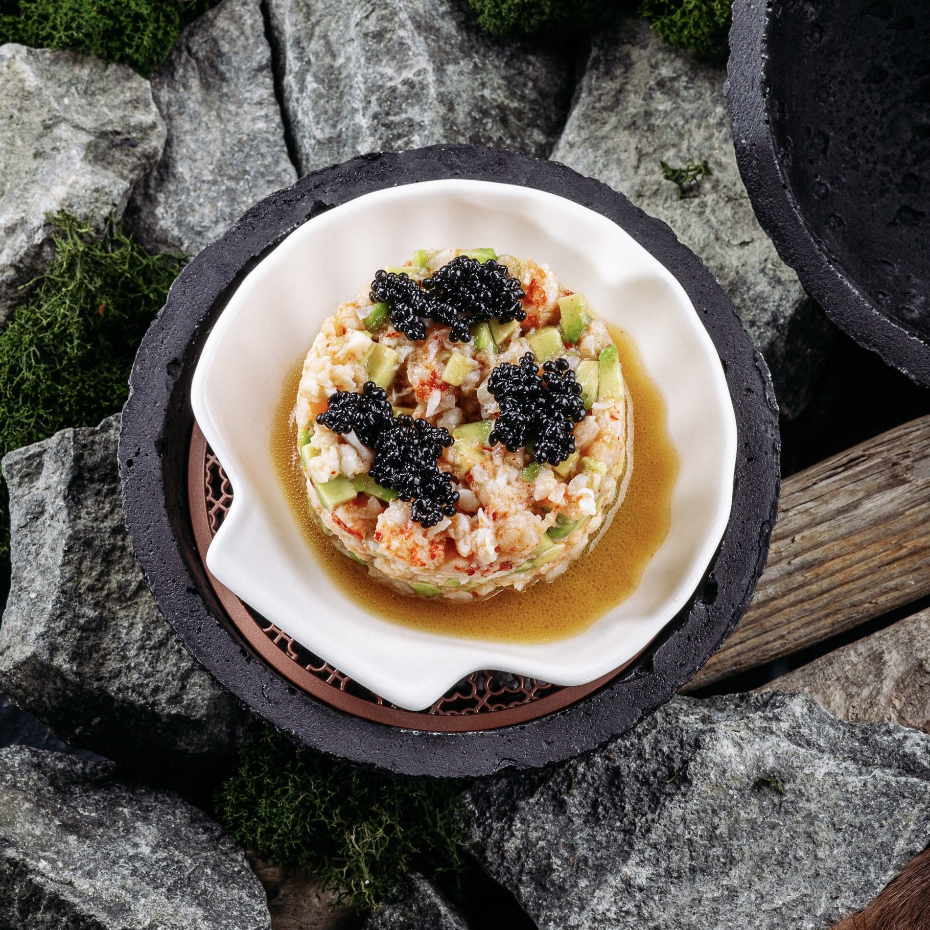Раковые шейки, авокадо, икра палтуса, подается с пряно - цитрусовым соусом, хрустящим багетом, украшенный микрозеленью. на 1 порцию: Кк 95, Ж 5, Б 2, У 10